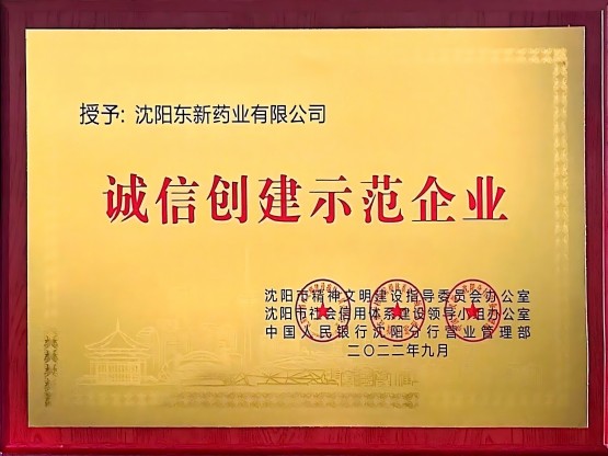 2023年3月15日,沈陽市文明辦、沈陽市信用辦在沈陽舉行了“沈陽市誠信創建示范單位授牌暨2023年誠信創建活動啟動儀式”。沈陽東新藥業有限公司被授予“誠信創建示范企業”的稱號。這是社會、行業、市場對東新藥業誠信經營的充分肯定及高度評價。東新藥業將一如既往的誠信履約、規范管理,打造最值得信賴的企業和最可靠的產品。